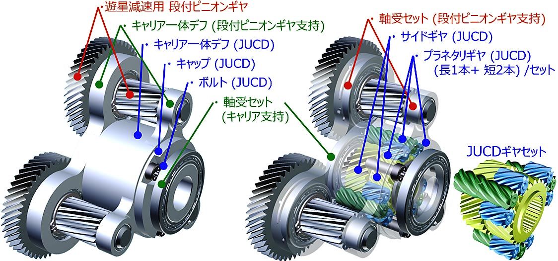 モーターとデフがオフセット配置される一般的な3軸式eアクスルに対し、モーターとデフを同軸上に配置するeアクスルは小型化に有利で市場拡大が期待される。同社は、2022年8月に従来のデフを小型化したJUCDを開発した。出力150キロワット級のeアクスル向けデフ単体として幅を約25ミリメートル縮めた。今回は、このJUCDと遊星減速キャリアを組み合わせることで、幅寸法を約50ミリメートル縮めた。デフハウジングを円筒形としてキャリア部と一体化し、トルク伝達時のハウジング変形・バラツキを抑えることで減速機のNV(ノイズ・振動)性能も確保した。