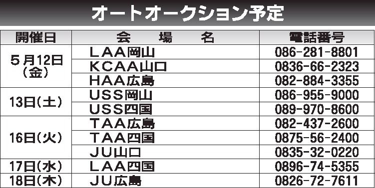 〈オートオークション予定〉中四国地区 2023/5/12~18