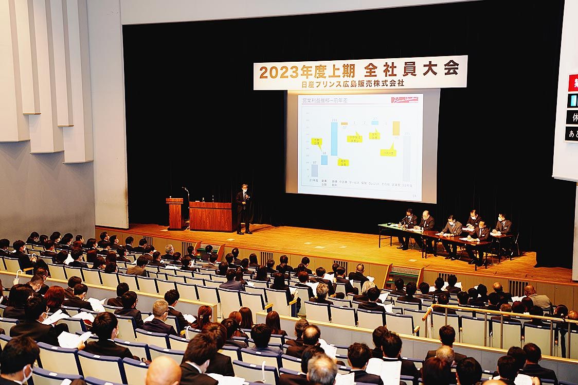 日産プリンス広島(宮崎真澄社長)は、広島市南区民文化センターで「2023年度全社員大会」を開催した=写真。メーカー社長賞の獲得に向け、23年度の事業計画を発表。各分野でのデジタルトランスフォーメーション(DX)の活用も発表した。 23年度...