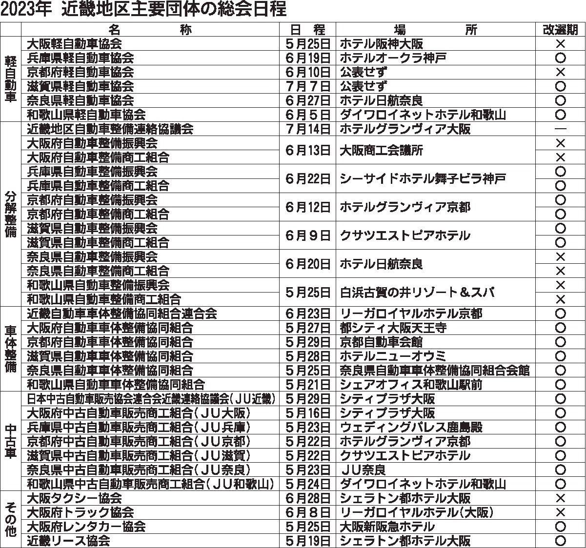 近畿地区の主要な自動車関連団体の定期総会が始まった。10日にホテル阪神大阪(大阪市福島区)で開催した大阪府自動車部品販売組合(池本裕行理事長)を皮切りに、7月中旬にかけて各団体が総会を行う。25団体が役員の改選期を迎える。 新型コロナウイ...
