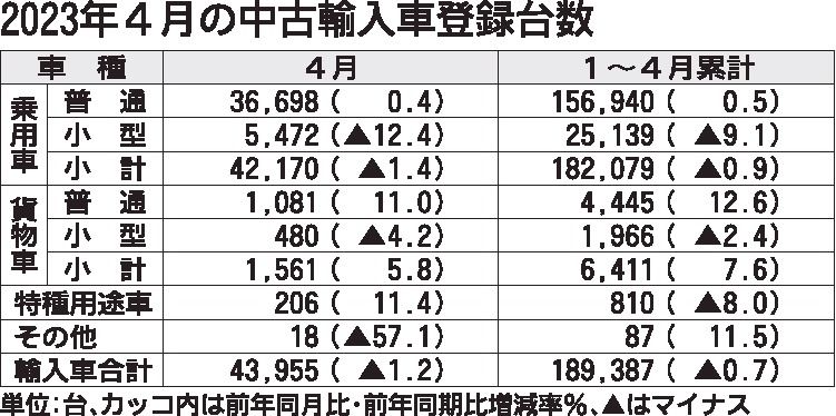 日本自動車輸入組合(JAIA、上野金太郎理事長)が15日発表した2023年4月の中古輸入車登録台数は、前年同月比1・2%減の4万3955台で3カ月ぶりのマイナスだった。中古輸入車の9割超を占める乗用車のうち、小型車が落ち込み、普通車や貨物...
