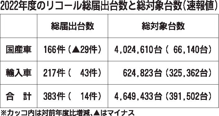 国土交通省は、2022年度のリコール(回収・無償修理)届出台数が前年度比9.2%増の464万9433台だったと発表した。総届出件数は同3.8%増の383件だった。ともに前年度実績を3年ぶりに上回った。