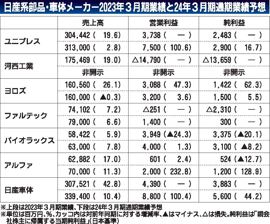 日産自動車を主取引先とする部品・車体メーカー7社の2024年3月業績見通しは5社が増収、6社が営業増益を見込む。日産は今年度、前年度比2割増となる410万台の生産を計画する。各社は、コロナ禍で進めた固定費削減などの収益強化策に増産効果を重...