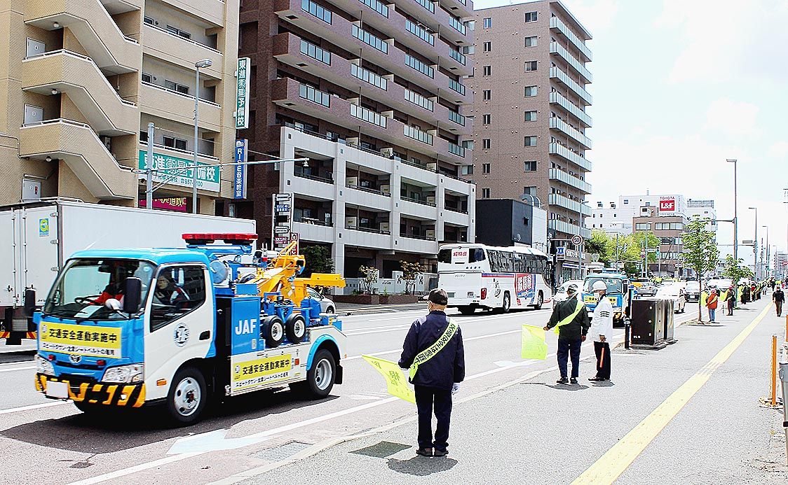 日本自動車連盟(JAF)札幌支部(横井隆支部長)は11日、交通安全啓発活動の一環として「交通安全パレード」を実施した。レッカー車2台が市内約15㌔㍍のコースを走行し、ドライバーらに交通安全を呼び掛けた。 5月11~20日の期間に全国で展開...