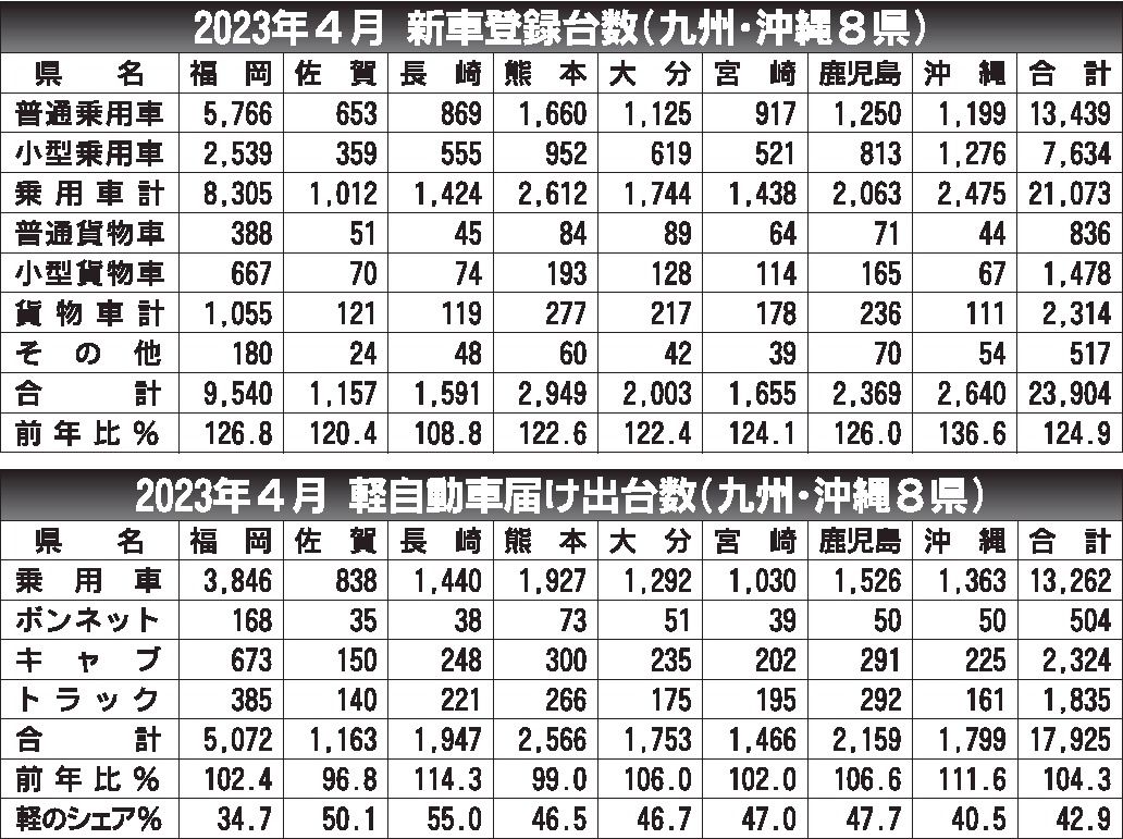 九州・沖縄地区の4月の新車販売台数は、前年同月比15・2%増の4万1829台となり、8カ月連続でプラス基調を維持した。登録車は4カ月連続、軽自動車は8カ月連続で前年実績を上回った。人気車種はいまだ長納期の状況にあるものの、新車の供給量は大...