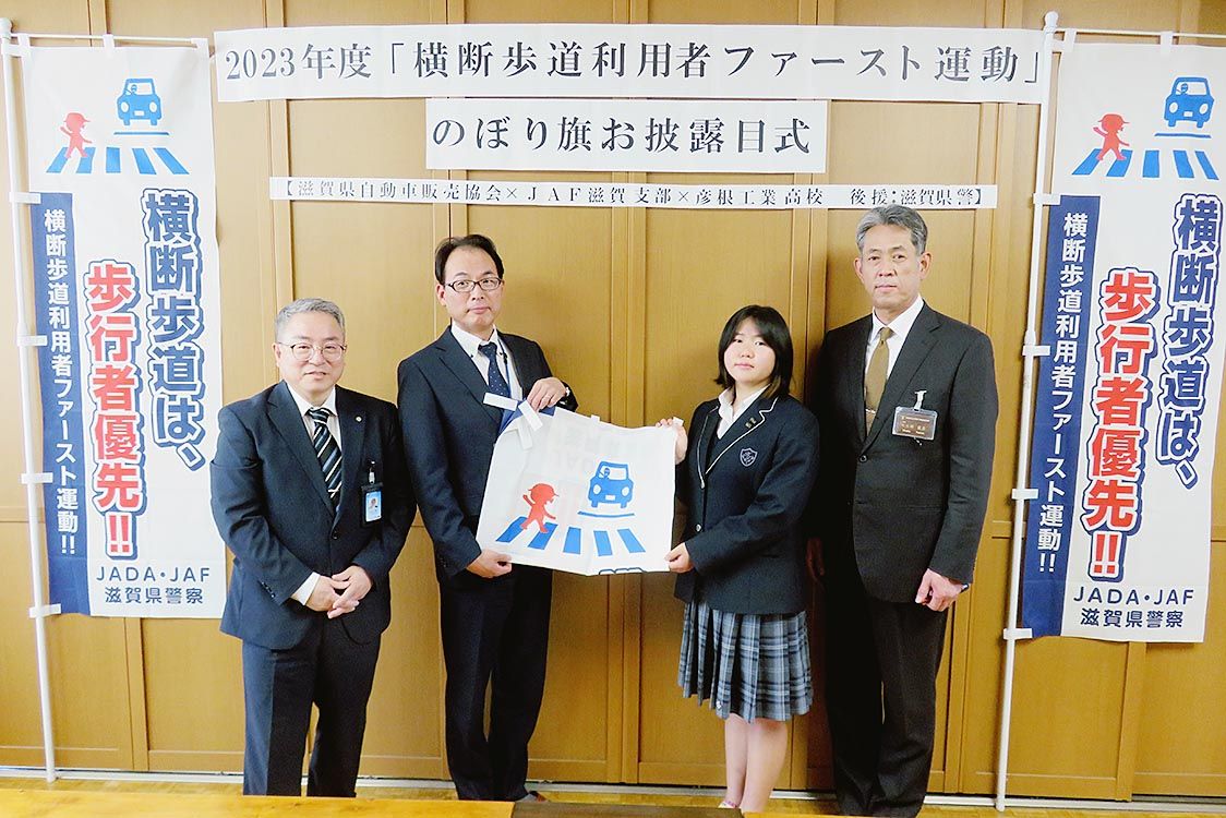 【大津】滋賀県自動車販売店協会(中嶋善夫会長)と日本自動車連盟(JAF)滋賀支部(小谷博之支部長)は、彦根工業高校(彦根市)で「横断歩道利用者ファースト運動のぼり旗お披露目式」を開催した=写真。県民の交通安全意識の啓発を目的にのぼり旗を制...
