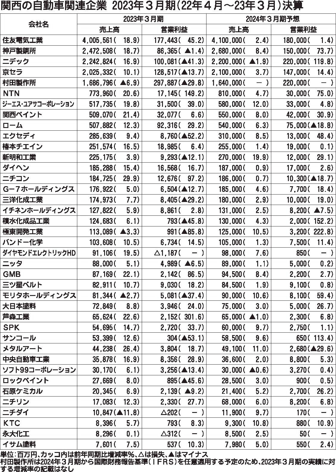 関西地区に本拠を置く上場企業の2023年3月期決算が出揃った。自動車の生産回復や円安などから、39社中20社が増収増益となった。24年3月期見通しについては、半導体不足が解消に向かい、自動車の生産台数が増加することを見越し増収増益を予想す...