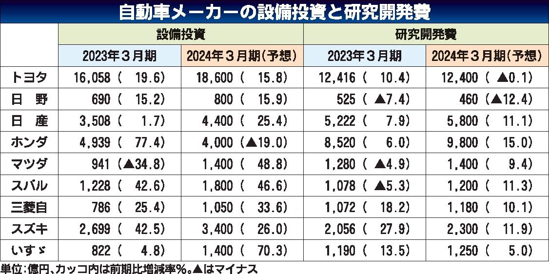 電動化に伴う投資が増え続ける。2024年3月期も自動車メーカー9社のうち、設備投資は8社、研究開発費は7社が前期実績を上回る資金を投じる。電動化ペースに地域差はあるが、開発や量産競争に劣後するわけにはいかない。投資競争に収束の気配はない。...