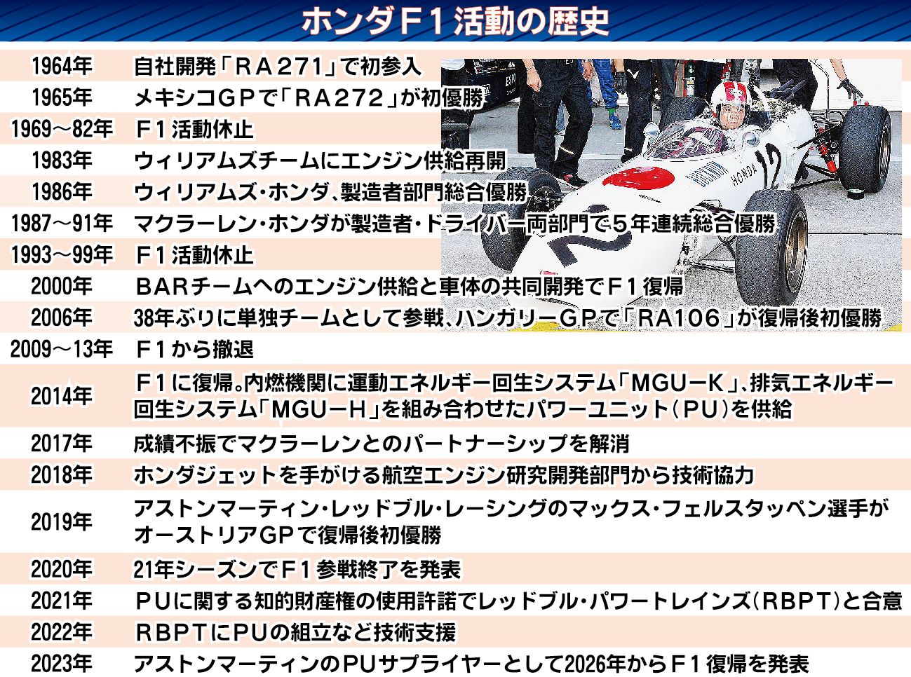 ホンダは24日、FIA(国際自動車連盟)のフォーミュラ・ワン(F1)世界選手権に2026年から復帰すると発表した。英アストン・マーティンのパワーユニット(PU)サプライヤーとしてホンダ子会社のホンダ・レーシング(HRC、渡辺康治社長)が参...