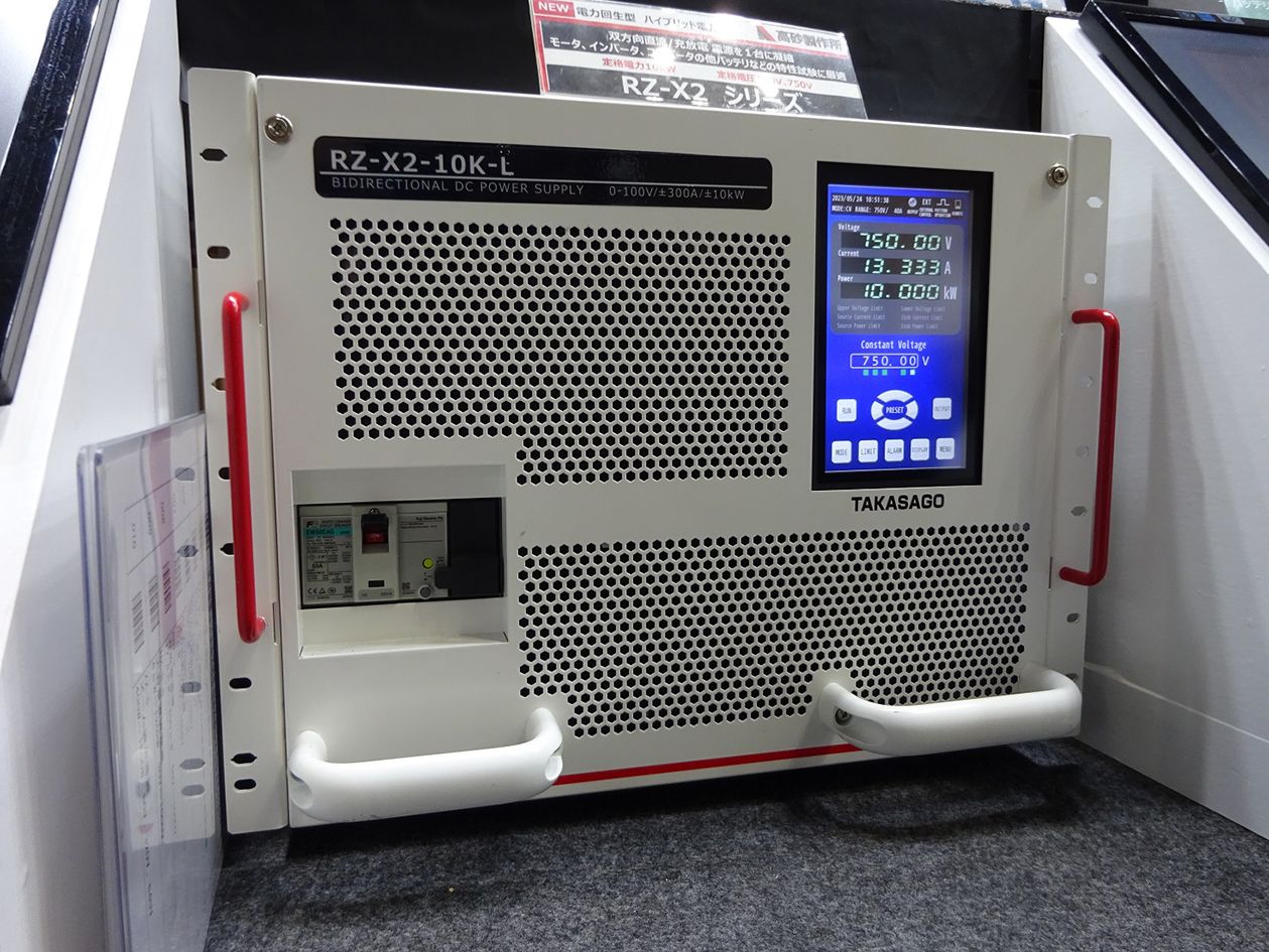 高砂製作所が手がける「電力回生型ハイブリッド電源」は充電と放電を繰り返して電池の性能を測る充放電試験で使う装置。電池に電気を供給したり、電池から電気を吸収したりすることができる。
