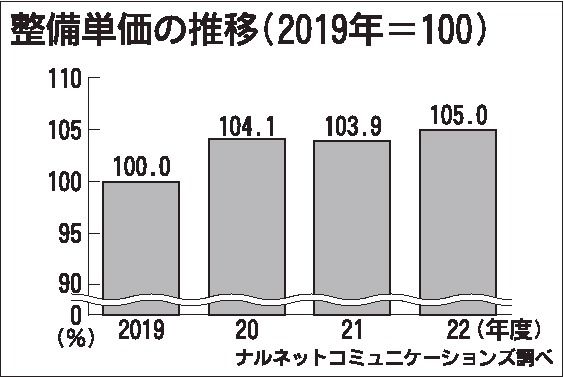 整備受託などを手掛けるナルネットコミュニケーションズ(鈴木隆志社長、愛知県春日井市)は、同社が管理する約7万台の業務用リース車両について、2020~22年度の補修部品と工賃を合算した整備費用の変動を分析した。これによると、19年度と比べて...