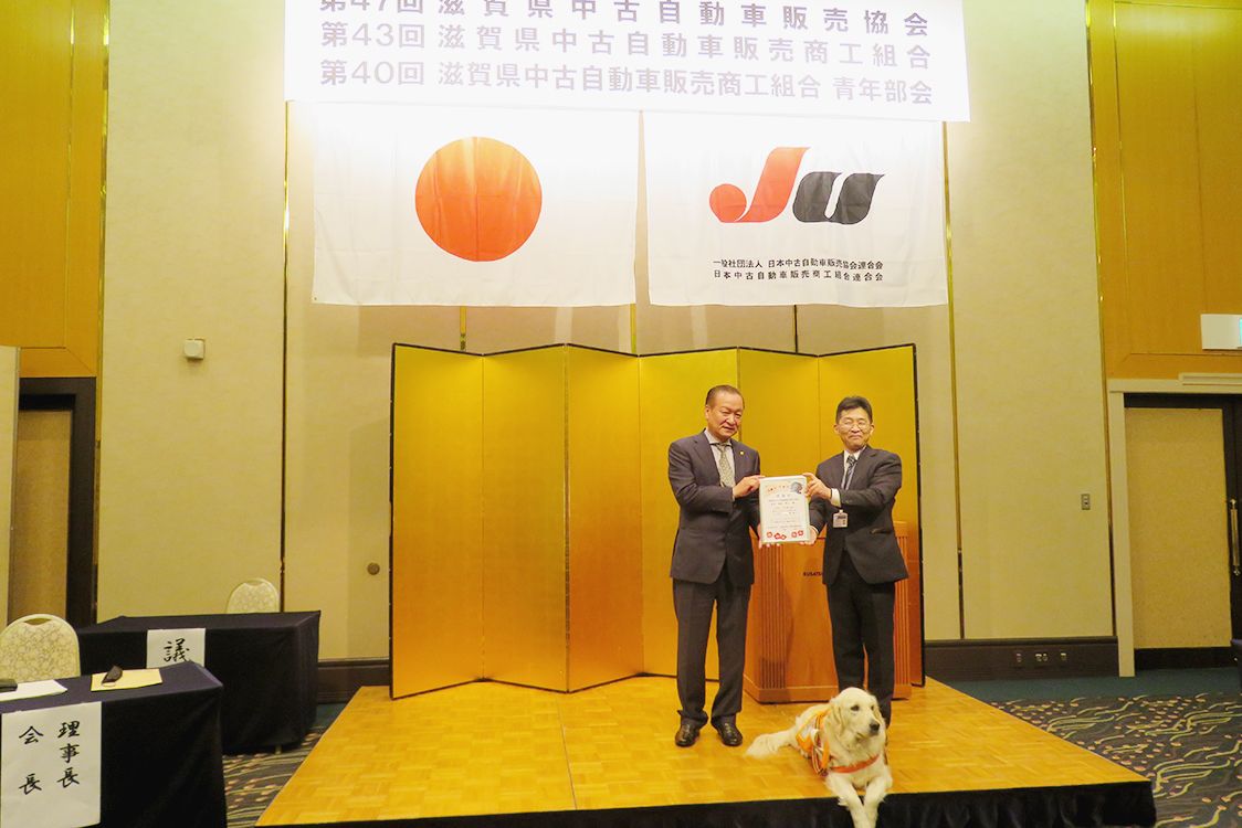 【大津】JU滋賀(池田秀人会長・理事長)は22日、草津市のホテルで開催した通常総会の席で、関西盲導犬協会(平芳一法会長)に浄財10万円を寄付した=写真。毎年行っている社会貢献活動の一環で、今年は初めて総会の席上で関係者を招いて寄付を実施し...