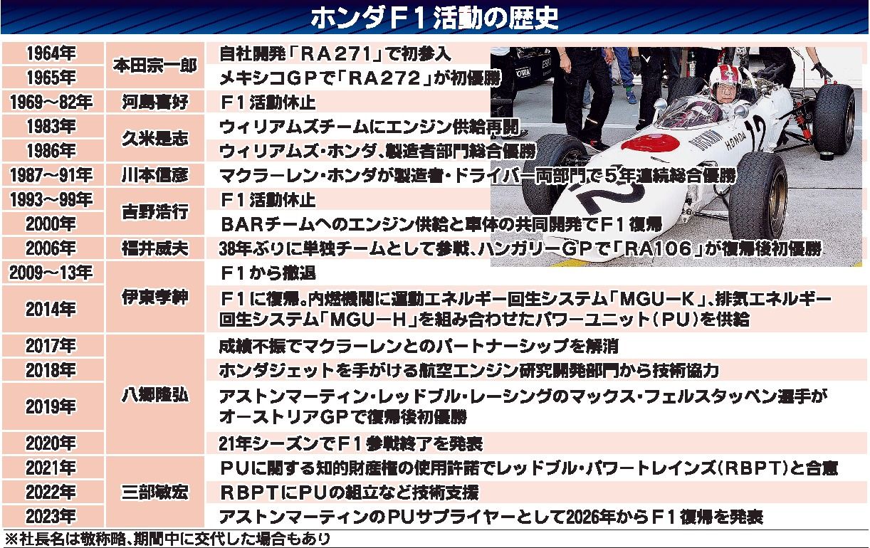 ホンダがフォーミュラ・ワン(F1)復帰を発表した。レース子会社のホンダ・レーシング(HRC、渡辺康治社長)が内燃機関とモーターを組み合わせたパワーユニット(PU)を2026年シーズンから英アストンマーティンに供給する。PUにおける電力利用...