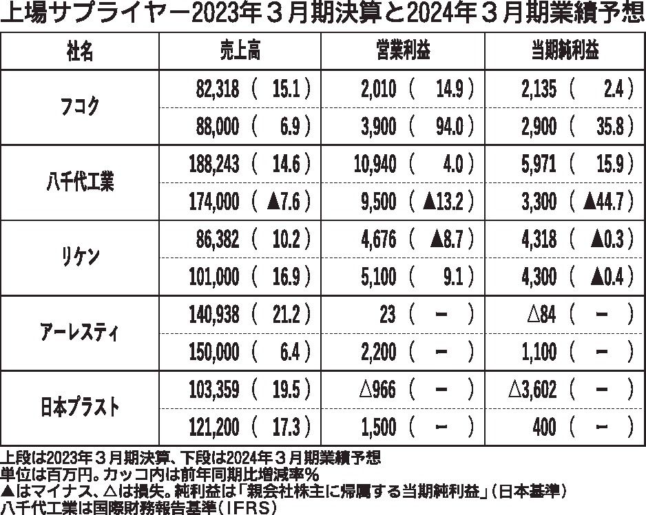 〈上場サプライヤー2023年3月期決算と2024年3月期業績予想〉(6/2付)
