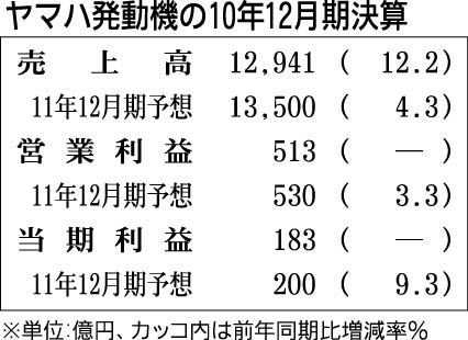 ヤマハ発動機が15日発表した2010年(1~12月)連結決算は売上高が前期比12・2%増の1兆2941億円と3年ぶりの増収、営業利益は513億円、当期純利益は183億円となり2年ぶりに黒字転換した。二輪車の販売がアジアを中心に上向いたこと...