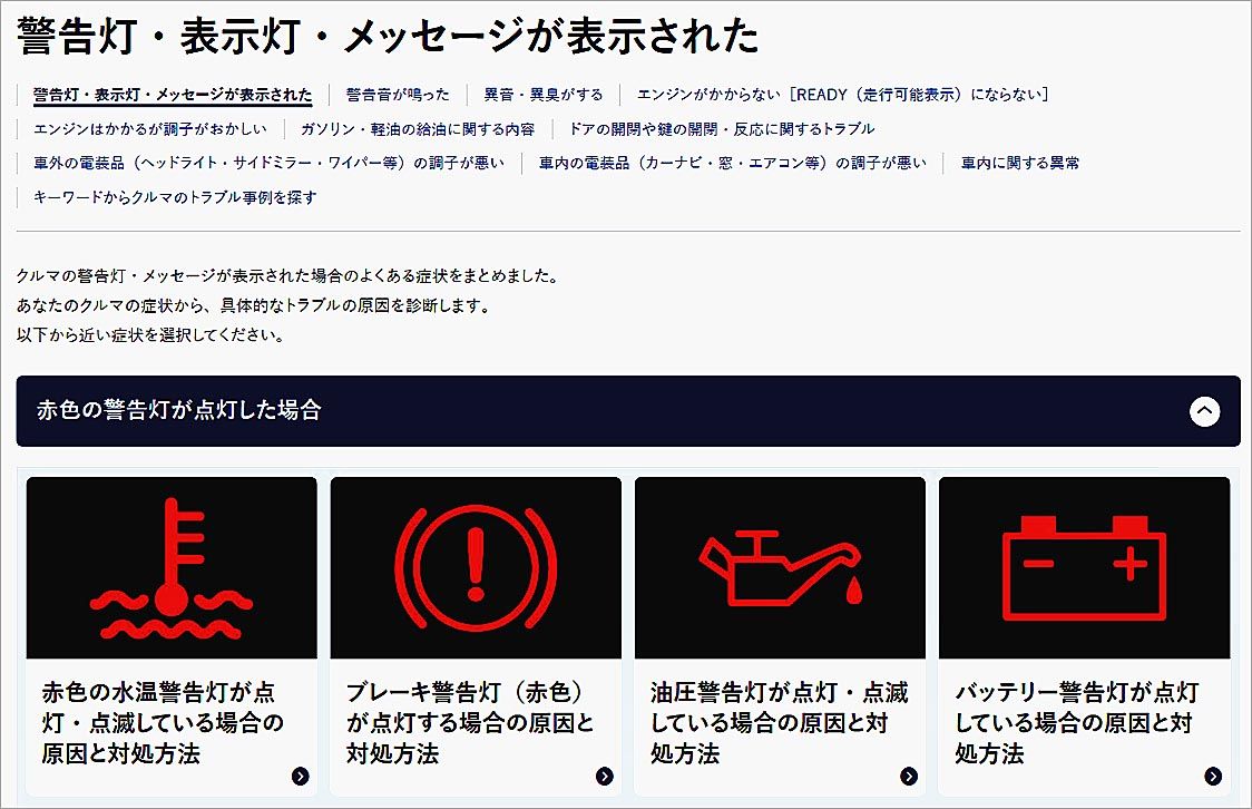 トラブルの対処方法は「警告灯・表示灯・メッセージが表示された」や「異音・異臭がする」「エンジンはかかるが調子がおかしい」など10の症状から探すことができる。個別ページには症状の原因のほか、ドライバー自らで可能な対処方法を掲載。自己解決が難しい症状では、ロードサービスなど適切な相談先を案内する。相談先も記載することで、ユーザーの時間のロスを軽減させる。