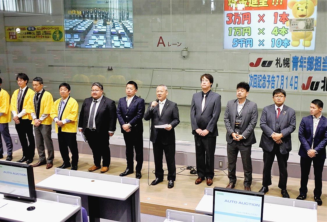 JU札幌(近藤昇理事長)は、今年度初めての青年部会(二本柳亨部会長)担当オークションを開き=写真=、出品台数は計画の1千台を上回る1046台を記録した。成約率は74・7%に上り、7開催連続で7割を超えた。 JU札幌の若手メンバーで組織する...