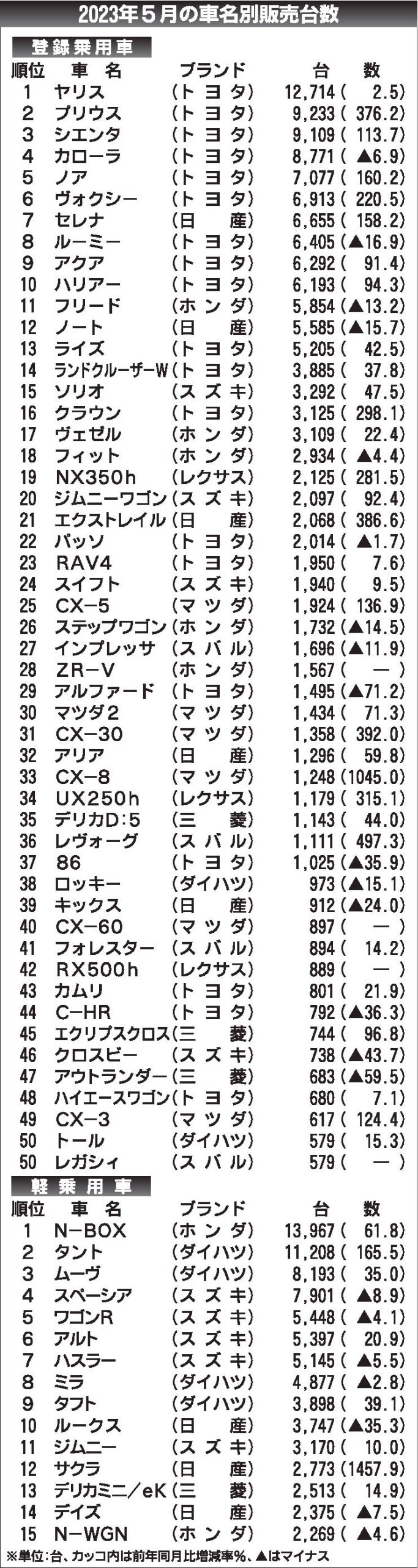2023年5月の新車販売ランキング、「N-BOX」9カ月連続首位 1~6月トップも濃厚 登録車2位は「プリウス」