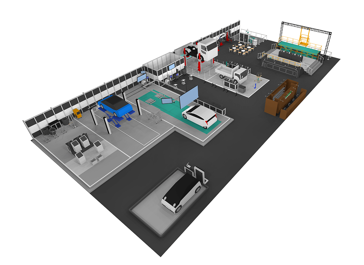 ブースは整備工場のストールを再現することで、機器活用シーンをイメージしやすく作り上げる。乗用車関連では、足回り機器や次世代車両への対応、車検やコンプライアンスに着目した製品も紹介する。