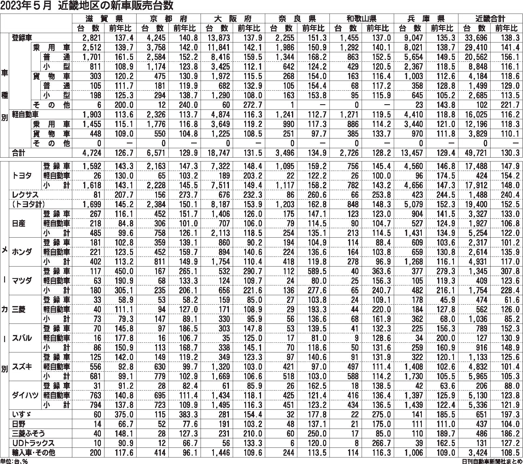 近畿地区2023年5月新車、9ヵ月連続の増加 30.3%増の49,721台