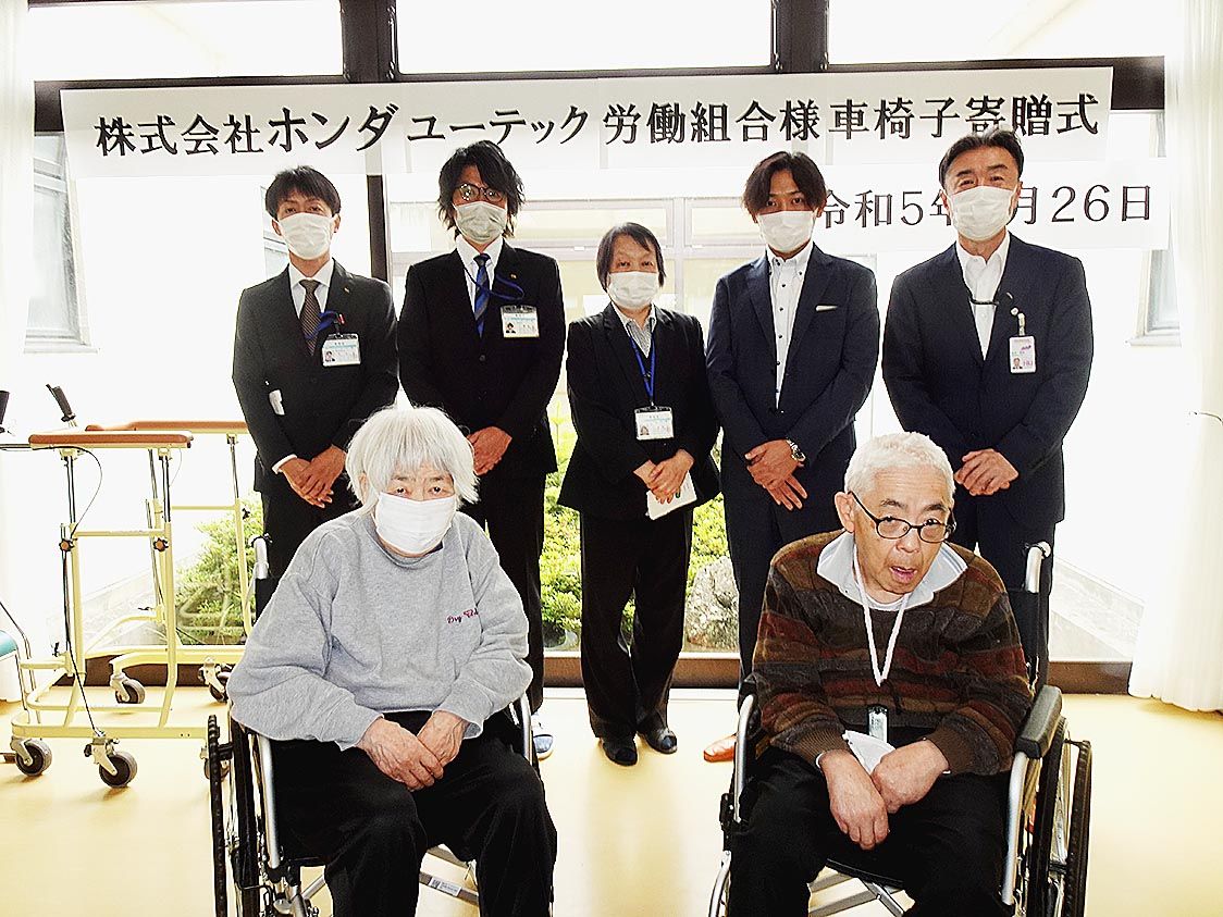 【仙台】ホンダユーテック労働組合(紺野真吾執行委員長)は仙台市青葉区の千代福祉会が運営する障害者支援施設・あおば園(三澤厚子園長)に車いす2台を寄贈した=写真。寄贈式では同労組の福山将石執行委員らが、三澤園長と施設利用者の代表者に贈った。...