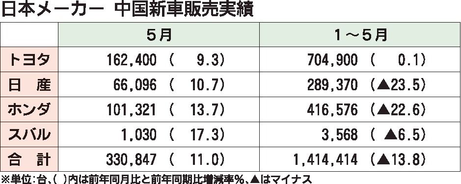 日本メーカー4社の5月の中国新車販売台数は33万847台(前年同月比11・0%増)となり、2カ月連続で増加した。前年同月の販売が上海のロックダウン(都市封鎖)で低調だったためだが、新型車効果や販促活動も奏功した。 トヨタ自動車、スバルが2...