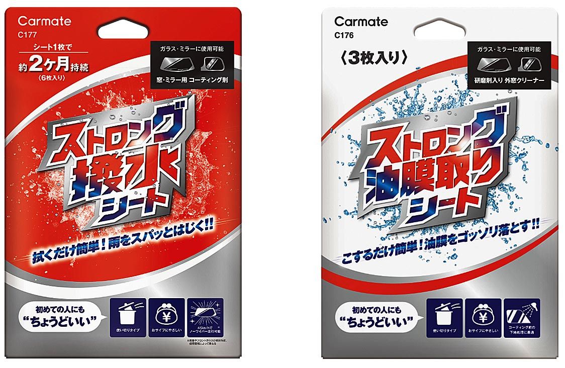 カーメイトは、シートタイプのはっ水材「ストロング撥水シート」と油膜取り用の「ストロング油膜取りシート」を発売した。はっ水タイプはシート自体にはっ水成分を含むため、道具を使わずにガラスにコーティングできる。1回の施工で2カ月間効果が持続する。油膜取りは、新開発の研磨剤液を採用。従来のウインドー用研磨剤と同等の性能を実現した。