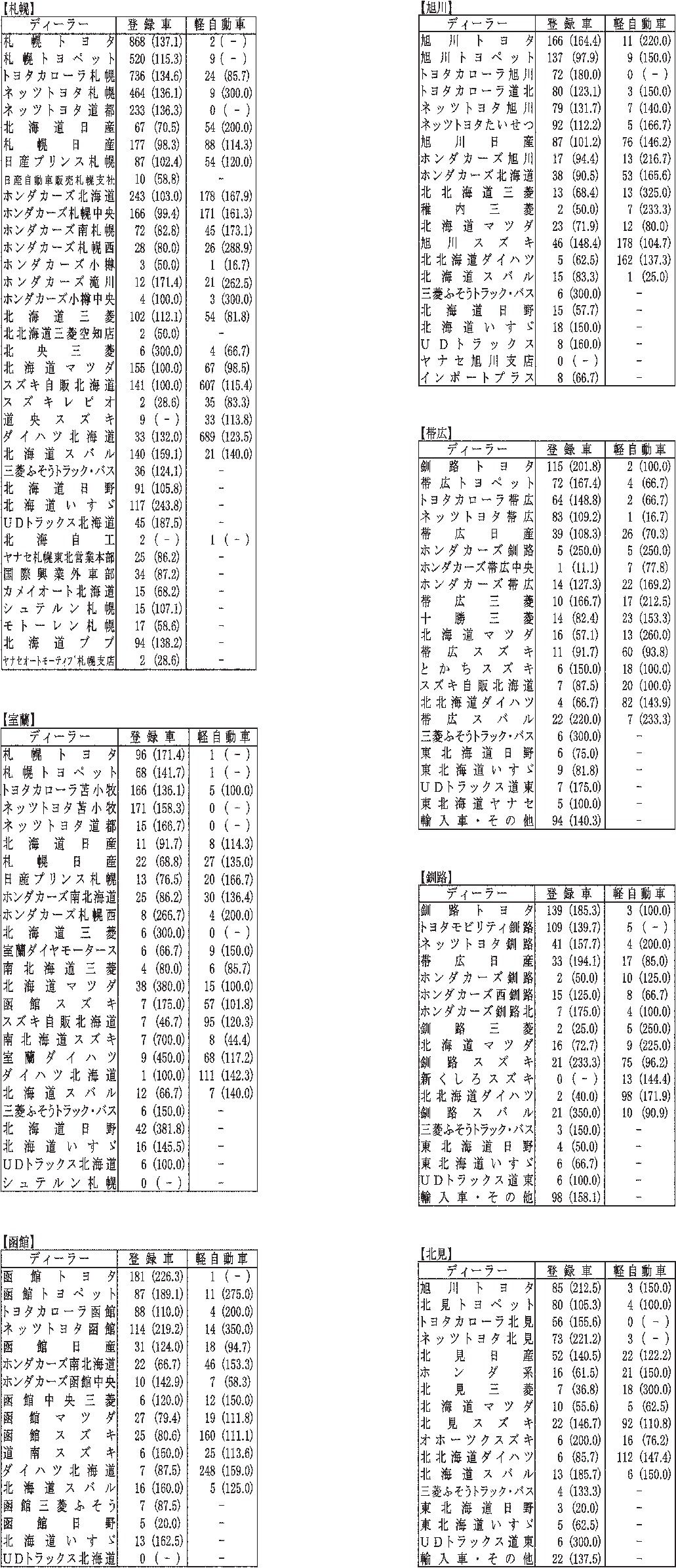 〈5月度全道管内別ディーラー別新車登録・届け出台数〉(カッコ内は前年同月比)※札幌管内ホンダ系・スズキ系の登録台数は自販連正会員分