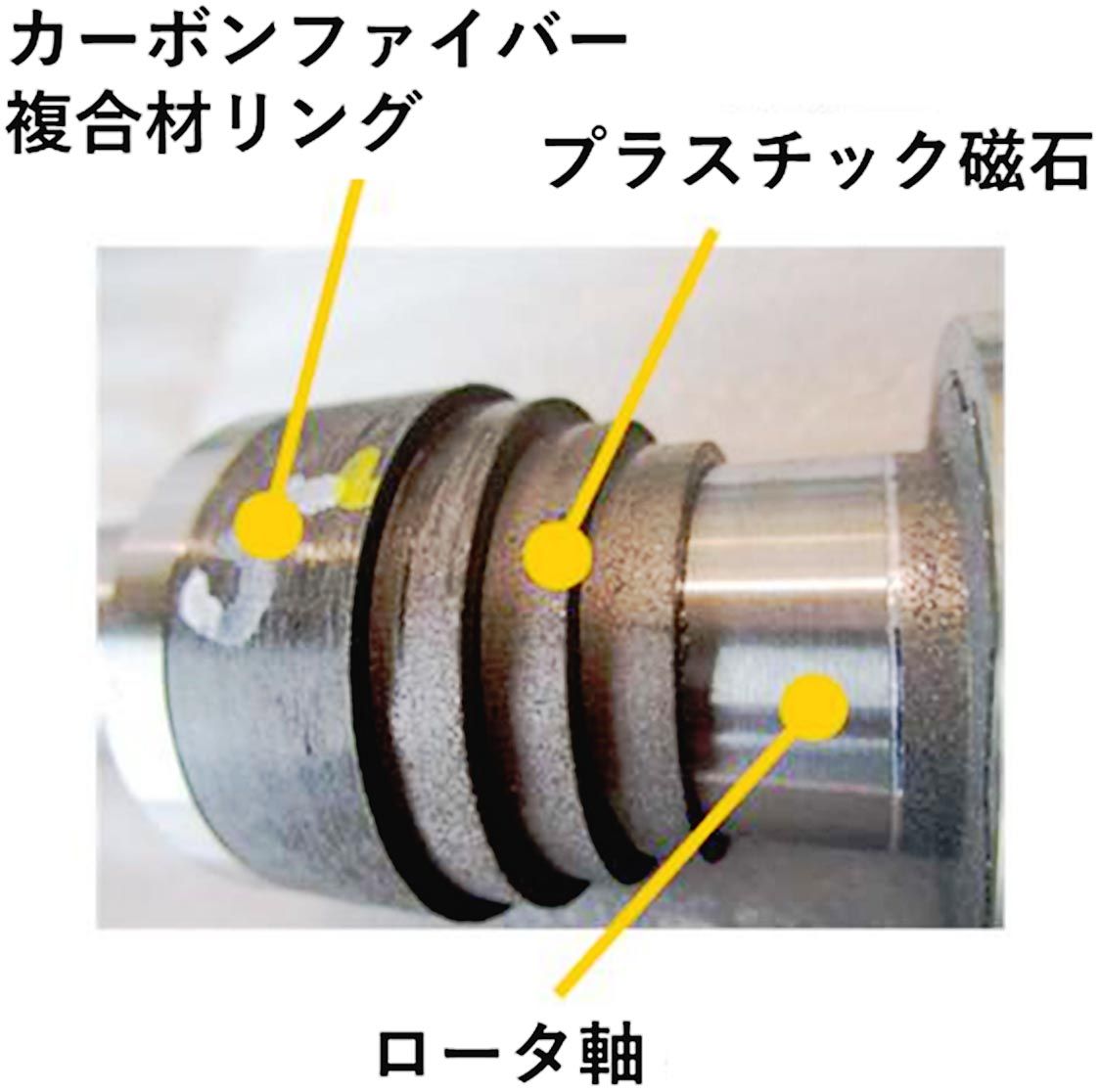 同社と秋田大学、秋田県産業技術センターの支援を受けた同県内の企業3社との連携で実現した。開発したロータ(回転子)は溶融したプラスチックに粉末磁石を混ぜて射出成形し、できたプラスチック磁石を特定方向の磁力を増強する「極異方性配向」で利用効率を最大化した。これを高強度のカーボンファイバー複合材(CFRP)リングで覆うことで、毎分10万回転を越える回転数に耐え得る構造とした。射出成形により機械加工を減らし、製造時間とコストの削減も期待できるという。
