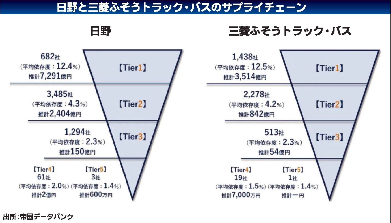 日野自動車と三菱ふそうトラック・バスが経営統合する。企業やブランドは残るが、両社は開発や調達、生産などで密接に連携し、相乗効果を狙う。帝国データバンクによると、両社と取引する部品メーカーは延べで約1万社、総売り上げ規模は約1兆4260億円...