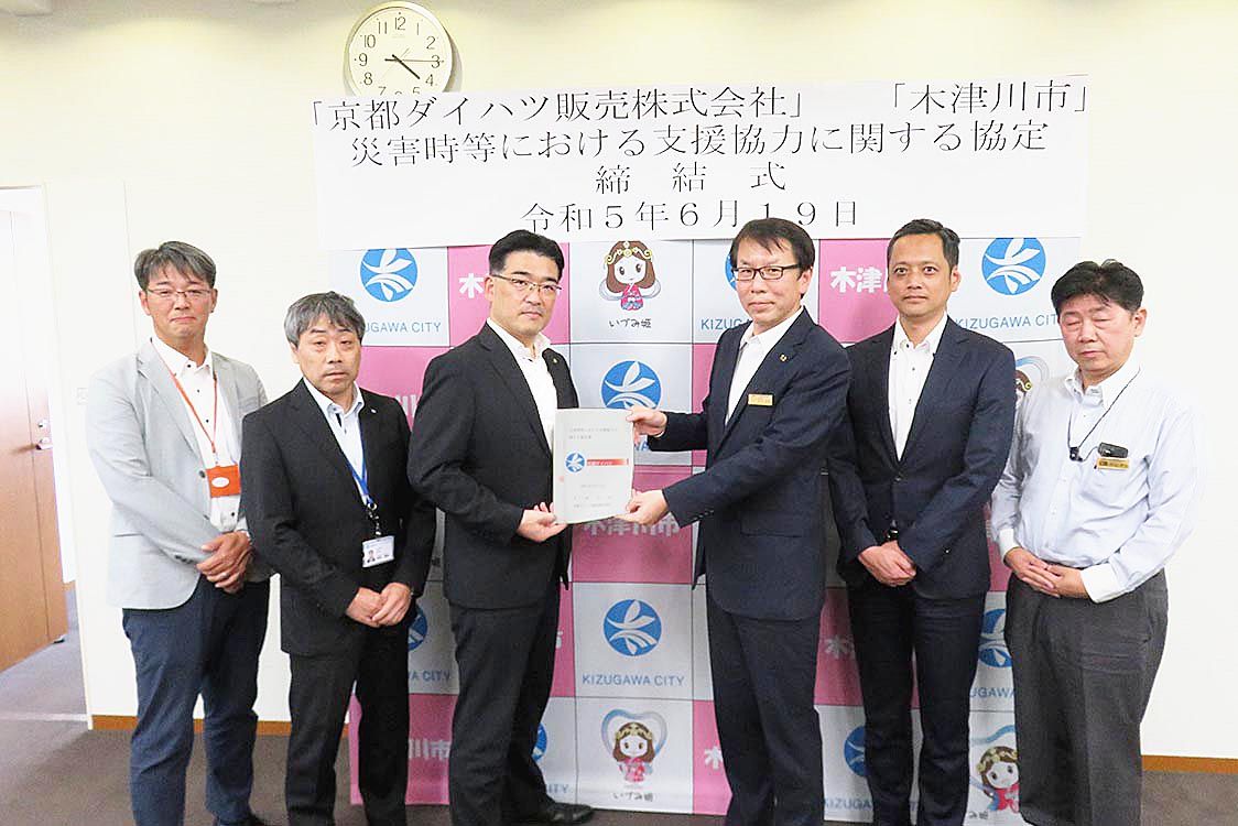 【京都】京都ダイハツ(有江真也社長)は、木津川市(谷口雄一市長)と「災害時等における支援協力に関する協定書」を締結した=写真。自然災害の発生時に同社の木津川店を避難場所として開放するほか、緊急移動時の車両貸与や給電システム付車両による電力...