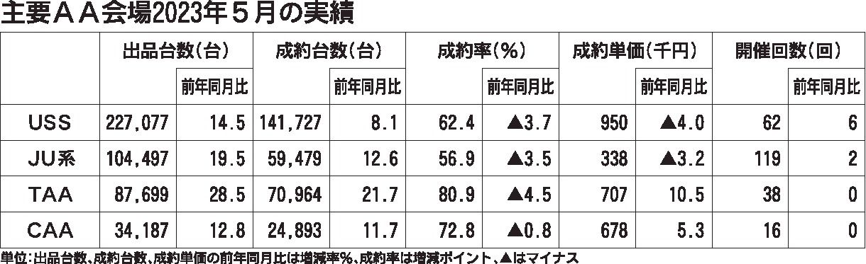 主要中古車オークション(AA)の5月の状況は、出品台数が前年同月を二桁以上上回る高水準で推移した。これに伴い、すべての会場で成約台数を伸ばしたが、成約率は前年同月を下回る結果となった。新車販売台数の増加に伴う下取り車の流通が増えている点は...