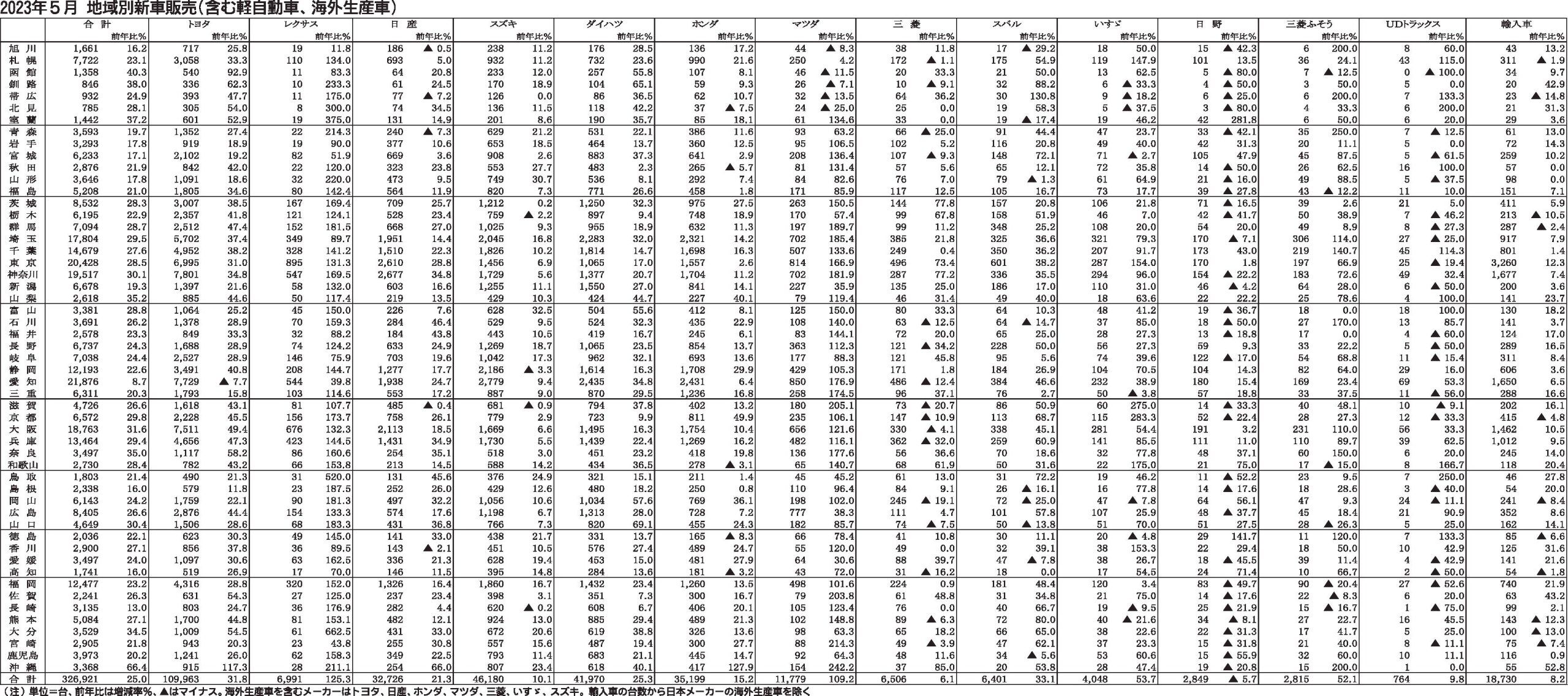 〈2023年5月 地域別新車販売(含む軽自動車、海外生産車)〉