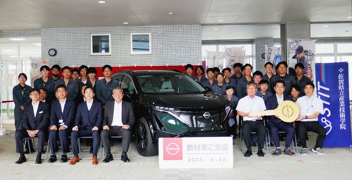 【佐賀】日産自動車と佐賀日産(福岡龍一郎社長)、日産サティオ佐賀(松本考司社長)は、自動車整備士の育成に役立ててもらうため、佐賀県立産業技術学院(池田積学院長、多久市)に、電気自動車(EV)「アリア」を無償貸与した=写真。関係者が出席し、...