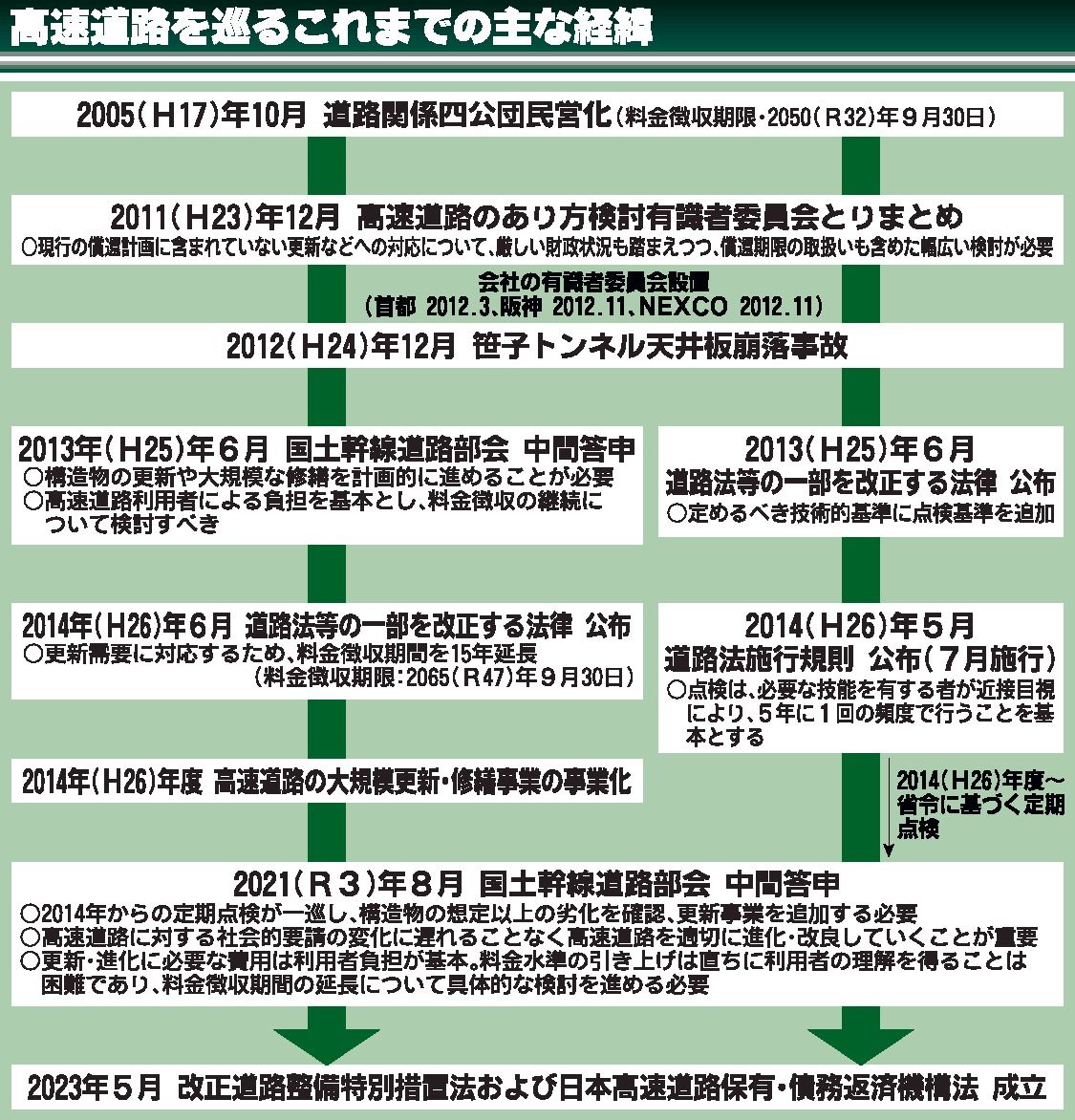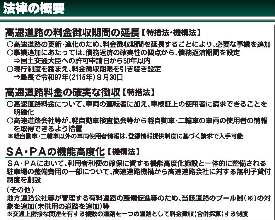 国会で5月末に改正道路整備特別措置法と関連法が成立し、高速道路料金の徴収期間が最長で2115年まで延長されることが決定した。徴収期間の延長で「高速道路無料化は事実上撤回」の声もあるが、これにより高速道路の老朽化対応や債務返済に必要な財源を...