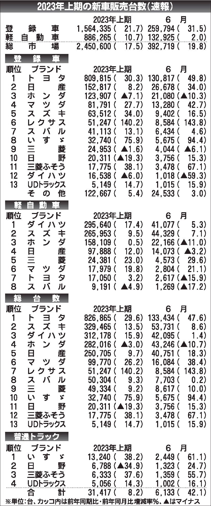 〈2023年上期の新車販売台数(速報)〉