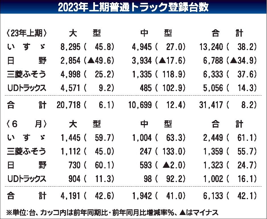 2023年1~6月の国内普通トラック販売、8.2%増で4年ぶりのプラス 日野以外は2桁の伸び