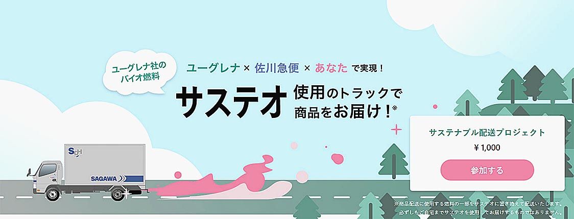 ユーグレナの公式サイトで製品を購入したユーザーを対象に、一口1千円から参加を募集する。参加したユーザーへの配送には、バイオ燃料が20%混合している「サステオ」を燃料として使用する。配送を担う佐川急便の浜松営業所のインタンクへ給油後、車両に給油する。まずは大型トラック6台が1カ月の配送に使用する燃料量に当たる約3千リットルをサステオに置き換えることを目指す。
