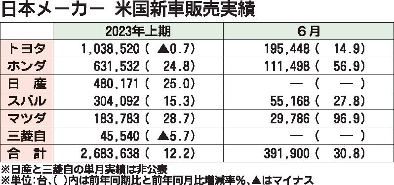 日本メーカー6社が6日までにまとめた2023年上期(1~6月)の米国新車販売台数は268万3638台(前年同期比12・2%増)と2年ぶりに増加した。ただ、コロナ禍の影響で反動増となり、大幅に台数を増やした21年上期の水準には届かなかった。...