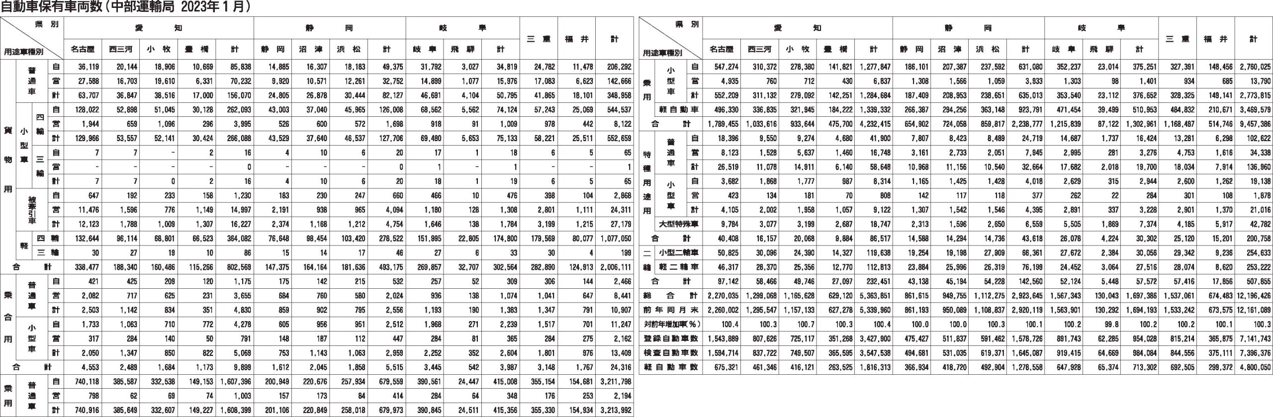〈自動車保有車両数(中部運輸局 2023年1月)〉