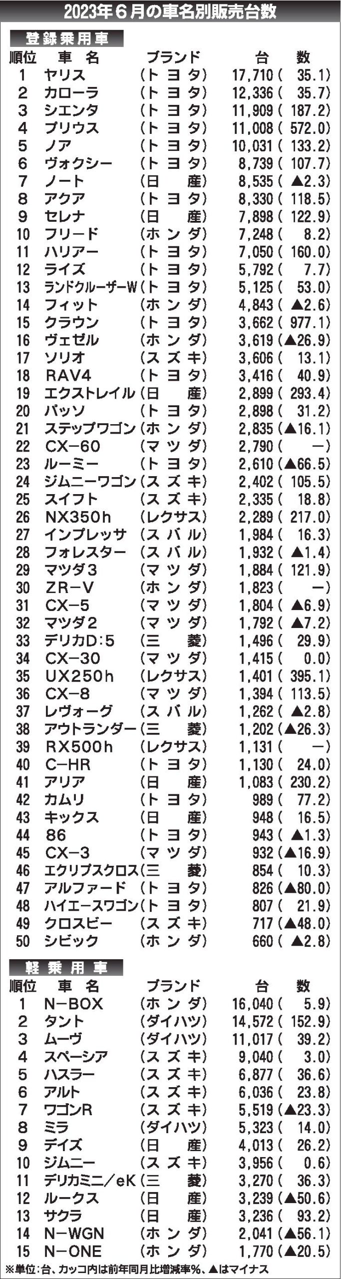 〈2023年6月の車名別販売台数〉
