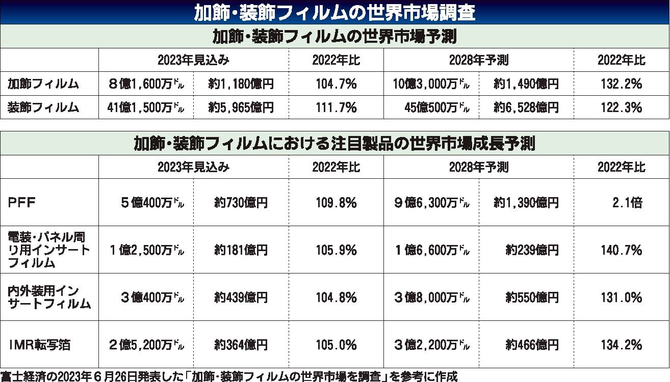 富士経済(菊地弘幸社長、東京都中央区)によると、加飾フィルムの世界市場は2028年に22年比32・2%増の10億3千万㌦(約1490億円)、装飾フィルムの世界市場も28年に同22・3%増の45億500万㌦(約6528億円)に拡大する見通し...