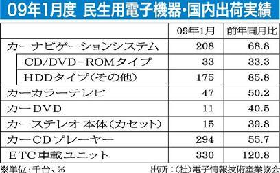 電子情報技術産業協会(JEITA)が発表した2009年1月度民生用電子機器・国内出荷実績は、前年同月比8.9%減の1668億円で4カ月連続のマイナスとなった。カーAVC機器は同38.6%減の346億円で4カ月連続のマイナスとなった。 カー...