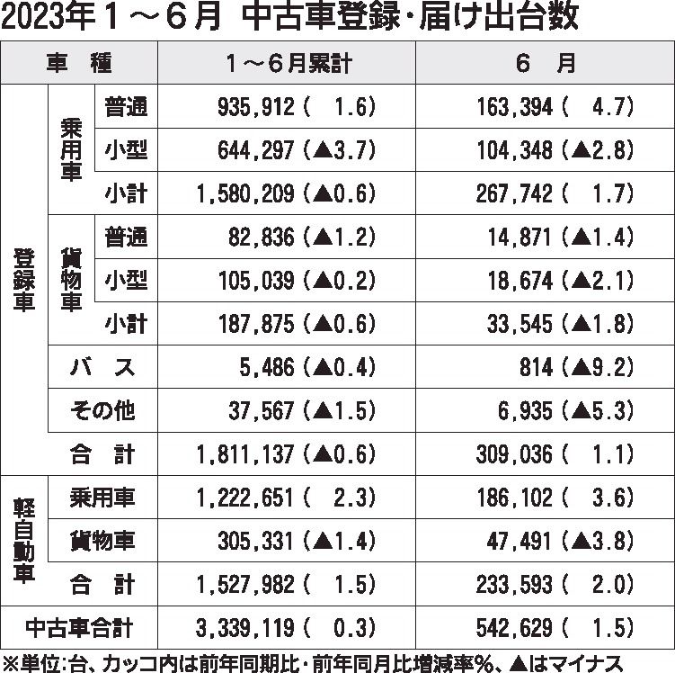 日本自動車販売協会連合会(自販連、金子直幹会長)と全国軽自動車協会連合会(全軽自協、赤間俊一会長)が12日発表した2023年上期(1~6月)の中古車登録・届け出台数は、前年同期比0・3%増の333万9119台だった。上期として2年ぶりの増...