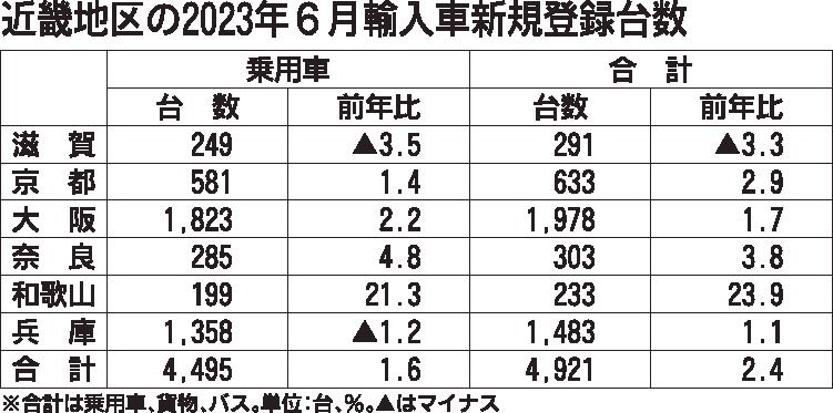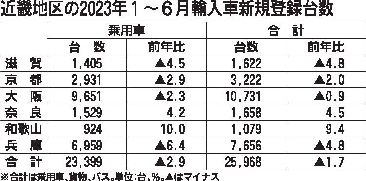 日本自動車輸入組合(JAIA)の発表によると、2023年上期(1~6月)の近畿地区の輸入車新規登録台数(外国メーカー車と日本メーカー車)は、前年同期比1・7%減の2万5968台と上期として2年連続で減少した。2桁減だった22年上期に比べ落...