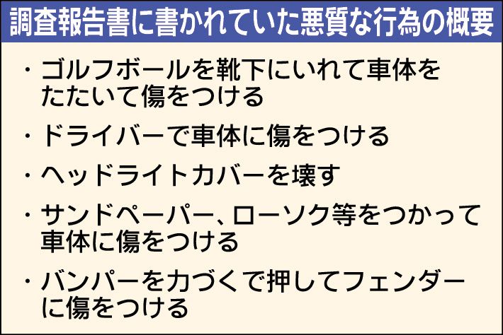 報告書の原本には、ゴルフボールを靴下に入れて振り回し車体をたたいてへこませたり、バンパーを力づくで押し込むなどしてフェンダーを傷つけたり、ヘッドライトカバーをわざと壊したりしていた調査内容が盛り込まれていた。同社では顧客の車を故意に壊し、修理費が余計にかかったことにする手口で、保険金を損保各社に水増し請求していた。