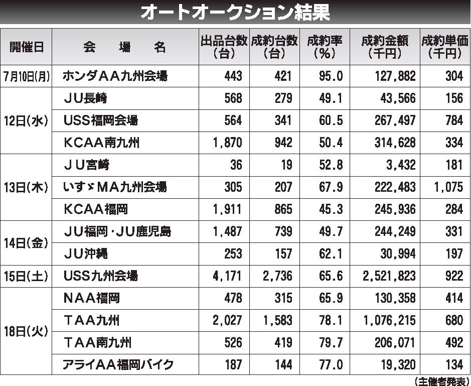 〈オートオークション結果〉九州地区 2023/7/10~18