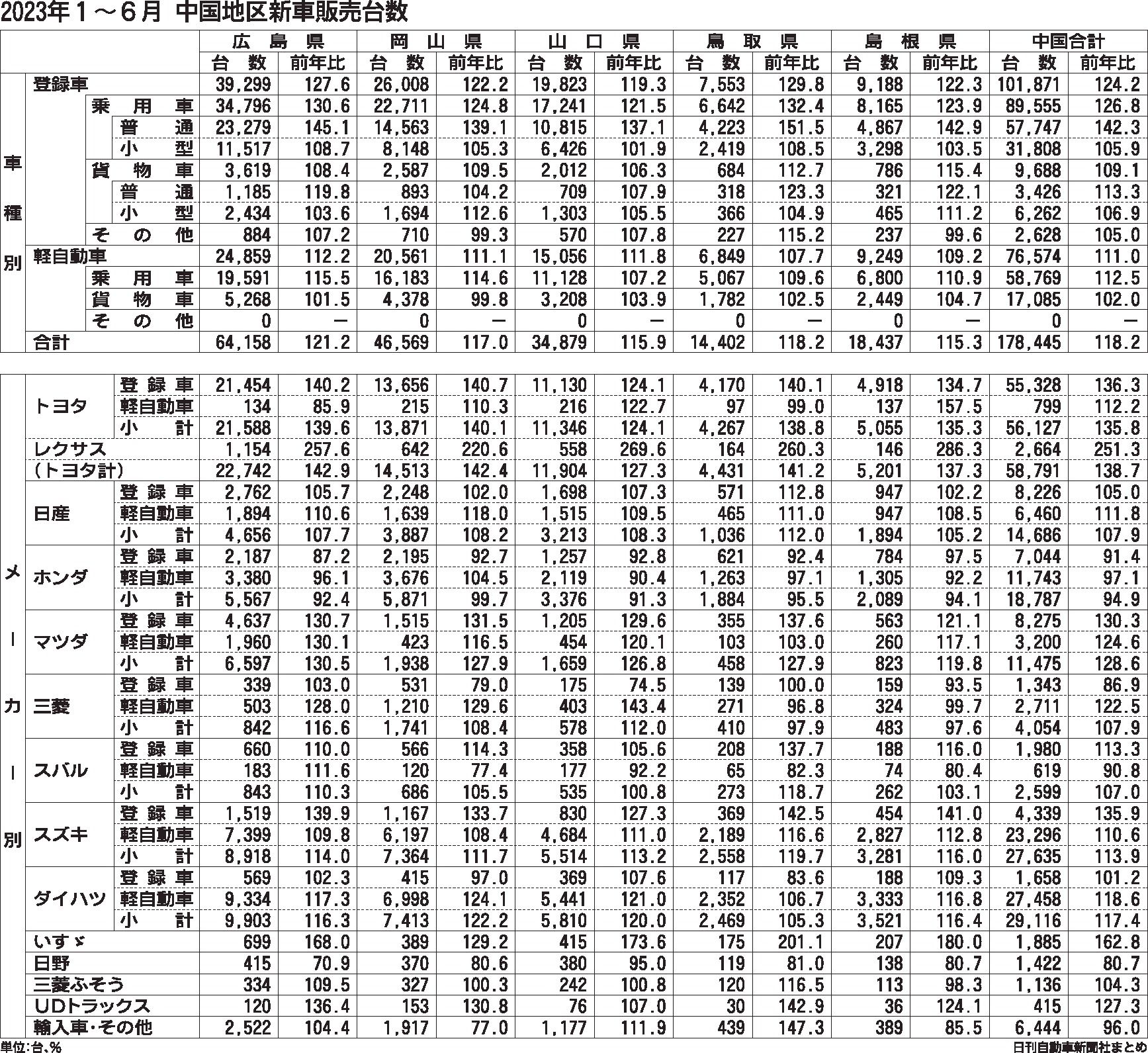 2023年上期(1~6月)の中国地区の新車販売台数(登録車と軽自動車の合計)は、前年同期比18・2%増の17万8445台となった。新車の供給が回復に向かい受注残の解消が進むなど、登録車、軽自動車ともに販売台数が伸び、中国5県全てが前年台数...