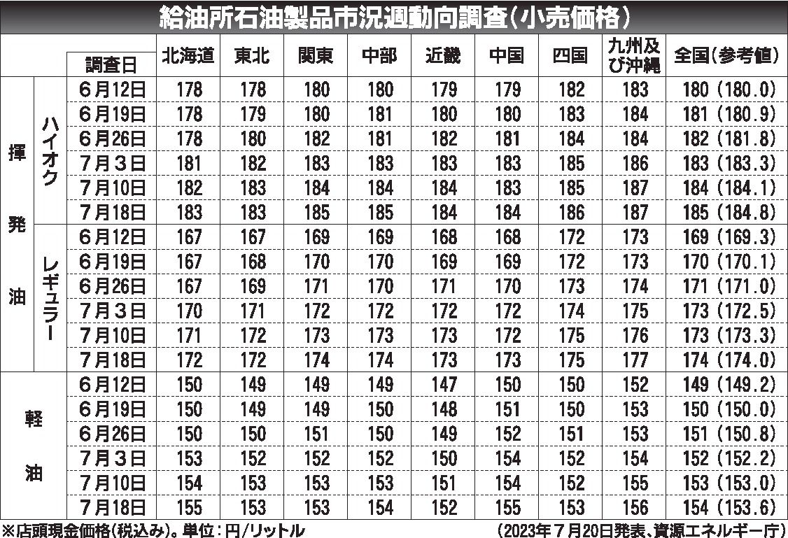 〈給油所石油製品市況週動向調査(小売価格)〉2023/6/12~7/18
