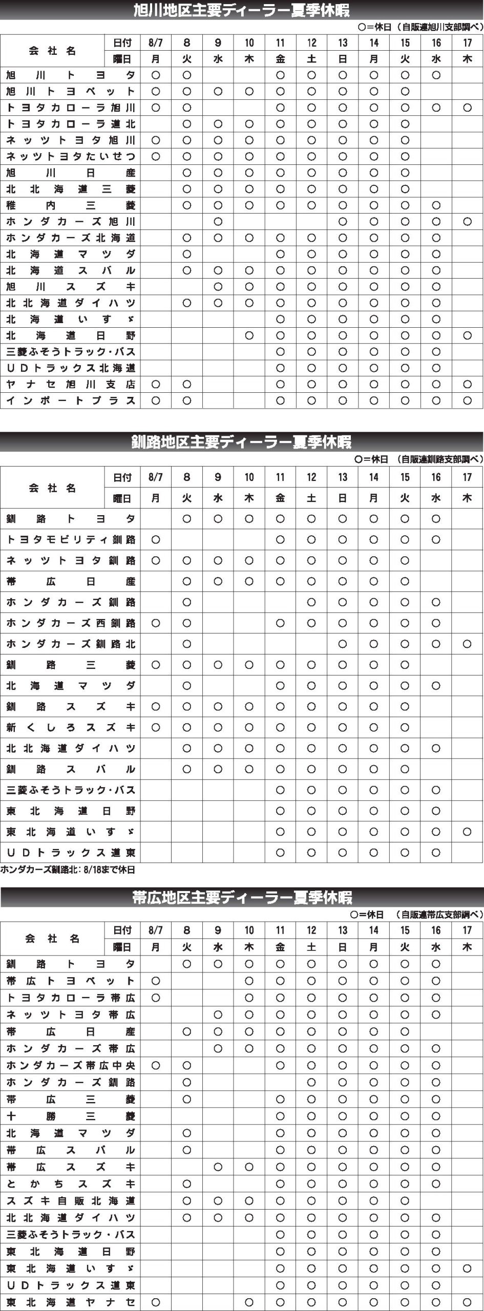 〈道内主要ディーラー夏季休暇表〉旭川/釧路/帯広